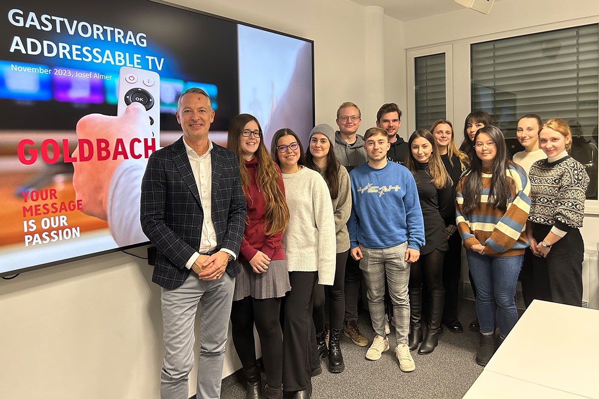 Anfang Dezember konnten die Studierenden der Spezialisierung „Media- und Kommunikationsplanung“ des Bachelor-Studiengangs „Marketing & Kommunikation“ Goldbach Austria in Wien besuchen. In einem aufschlussreichen Gastvortrag gab Josef Almer, Managing Director von Goldbach Austria und Experte auf dem Gebiet Addressable TV, interessante Einblicke in die Thematik und die Bedeutung für die Werbebranche.