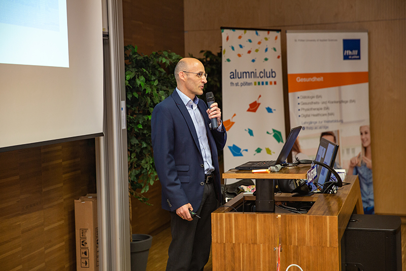Rund 80 Personen waren der Einladung gefolgt. Im offiziellen Teil des Abends referierte der Leiter des Departments Gesundheit, Jürgen Pripfl, über Veränderungen und Entwicklungen im Department Gesundheit, im Institut für Gesundheitswissenschaften sowie im Center for Digital Health Innovation. Bemerkenswerte Projekte der letzten Jahre sowie die im Jahr 2018 eingeworbenen Projekte wurden dabei vorgestellt.