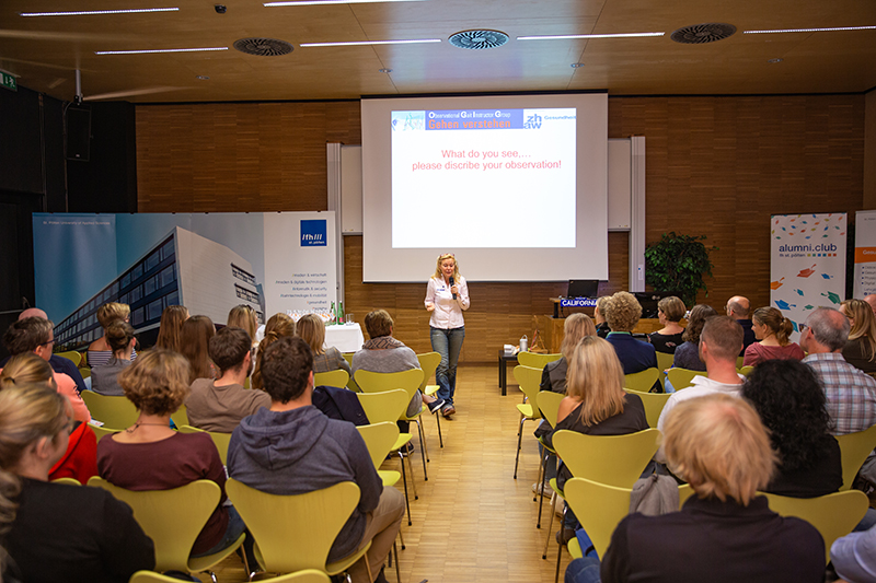 Im Anschluss daran gab es einen Fachvortrag der Präsidentin der Observational Gait Instructor Group, Frau Kirsten Götz-Neumann. Sie erläuterte die physiotherapeutische Vorgehensweise aus der Sicht einer biomechanisch orientierten Physiotherapie bei einem Kind mit Klumpfuß. Dabei wurden eindrucksvolle Videos über den Einsatz von technologischer Unterstützung, wie beispielsweise das Oberflächen-Elektromyografie als Feedbackinstrument, präsentiert. Die Referentin, die in Los Angeles arbeitet und lebt, ist eine international anerkannte Expertin auf dem Gebiet der Ganganalyse und Behandlung von gangtypischen Problemen. Sie gibt seit mehreren Jahren Kurse für Physiotherapie-Absolventinnen und -Absolventen an der FH St. Pölten und steht immer wieder für Fachvorträge zur Verfügung.