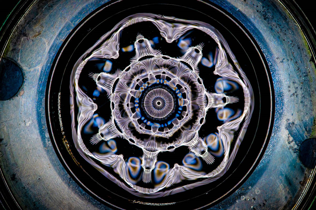Die eigene Schwingung hören und sehen, wie geht das? Newman experimentiert schon länger mit interaktiven Erfahrungen ästhetischer Klangvisualisierung im Wasser. Kymatik heißt dieses Forschungsgebiet der Physik, das sich mit sichtbaren Mustern der Wechselwirkung von Schallschwingungen in Materialien befasst.