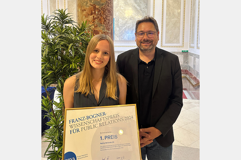 „Der Studiengang Marketing & Kommunikation ist stark praxisorientiert – das ist unser Markenzeichen. Gleichzeitig legen wir großen Wert darauf, dass unsere Studierenden auch wissenschaftlich auf hohem Niveau arbeiten. Der Erfolg von Nadine Bartunek beim Franz-Bogner-Wissenschaftspreis für Public Relations zeigt, dass wir diesen Anspruch erfolgreich umsetzen“, freut sich Studiengangsleiter Helmut Kammerzelt über die Auszeichnung.