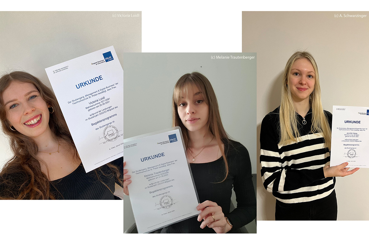 Studiengangsleiterin Irmgard Wetzstein gratuliert den Nachwuchstalenten mit einer Urkunde über die Mitgliedschaft im Begabtenprogramm und ergänzt: „Wir möchten kontinuierliche, herausragende Leistungen während des Studiums würdigen. Es ist eine kleine Geste, mit der wir zeigen möchten, dass Leistungen und guten Noten nicht unbemerkt bleiben! Herzlichen Glückwunsch und weiter so!“