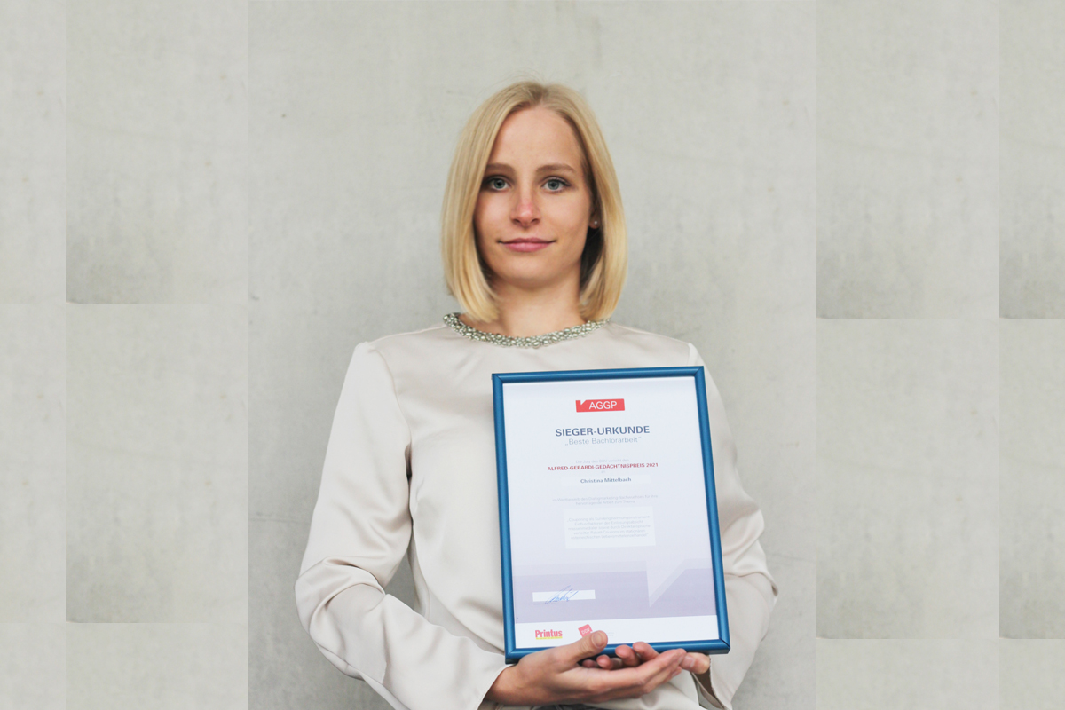 „Mit dem Ziel, eine wissenschaftliche Forschungslücke zu schließen, die gleichzeitig eine gesellschaftliche Implikation aufweist, ging ich an die Arbeit heran. Schließlich begleitet uns die COVID-19-Pandemie tagtäglich, wobei Rabatt-Coupons eine essentielle Rolle einnehmen. Dass meine Forschung mit dem Alfred Gerardi Gedächtnispreis ausgezeichnet wurde, ist eine große Ehre und zugleich eine Bestätigung für meine wissenschaftlich fundierte Ausbildung“, freut sich Christina Mittelbach über die Auszeichnung ihrer Bachelorarbeit.
