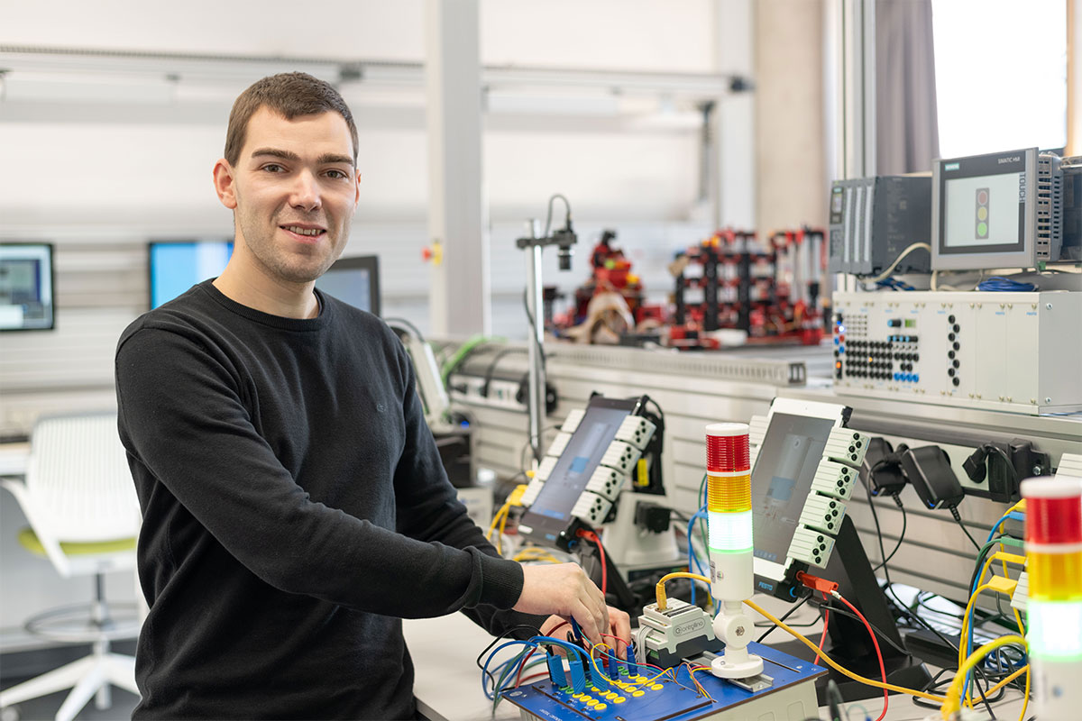 "Die Laborlehre ist ein wichtiger Pfeiler unseres Lehrplans, sie hat große Auswirkungen auf die Studierenden selbst und deren Arbeit im Unternehmen", sagt Thomas Felberbauer, Studiengangsleiter des dualen Studiengangs Smart Engineering. Wie das? Felberbauer erklärt: "Die Unternehmen profitieren von den Erfahrungen ihrer Mitarbeiter*innen zu aktuellen und neuen digitalen Technologien, die sie im Rahmen ihres Studiums in der Laborlehre erlangen. Dieses Wissen bringen sie dann natürlich ins eigene Unternehmen ein."