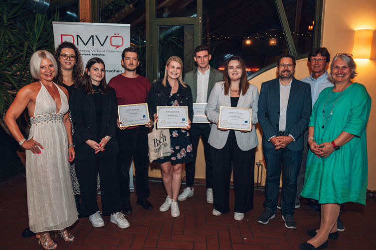 Im Rahmen des DMVÖ-Sommerfests fand die feierliche Siegerehrung des diesjährigen „Dialog Marketing Rookies“ statt. Dabei wurden die Preisträger*innen des Bachelor Studiums „Marketing & Kommunikation“ und des Masters „Digital Marketing & Kommunikation“ für ihre hervorragenden Leistungen und kreativen Ideen im Dialog Marketing geehrt.