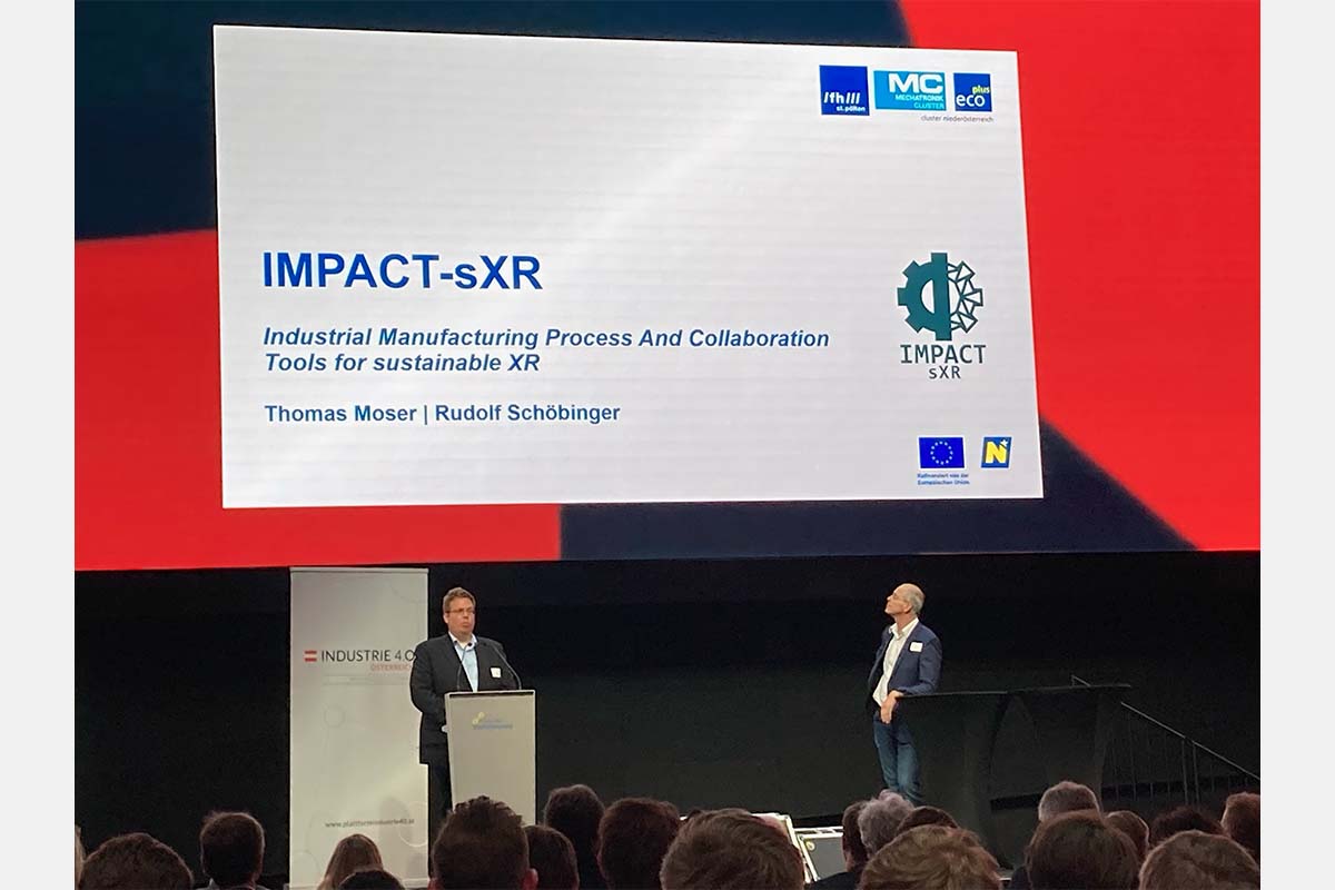 Thomas Moser stellte gemeinsam mit Rudolf Schöbinger (ZKW Group GmbH) das von der ecoplus geleitete Projekt IMPACT-sXR (Industrial Manufacturing Process And Collaboration Tools for sustainable XR) vor. Darin arbeiten Industriepartner*innen und Hochschulen zusammen, um mit der Hilfe von XR-Technologien neue Wege bei der Wissensvermittlung und bei der Optimierung von Arbeitsprozessen einzuschlagen. "Durch das große Netzwerk an Projektpartner*innen, nämlich 23 Partner*innen aus der Industrie und vier Hochschulen, ist eine große Vielfalt an Anwendungsfällen abgedeckt", erklärt Moser. "Das garantiert, dass das Wissen um die Einsatzmöglichkeiten von XR-Technologie große Verbreitung findet."