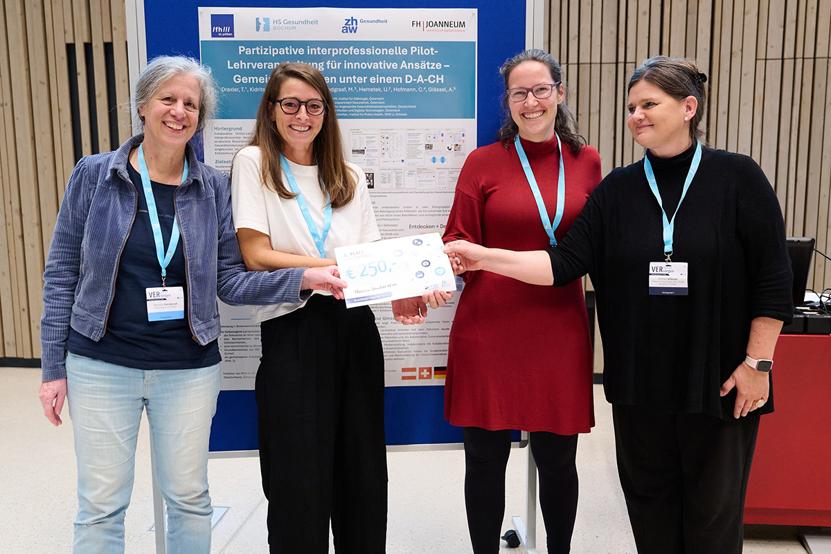 Zum krönenden Abschluss gewann das Poster „Partizipative interprofessionelle Pilot-Lehrveranstaltung für innovative Ansätze – Gemeinsam Lernen unter einem D-A-CH“ von Theresa Draxler (FH Joanneum), Anita Kidritsch, Frank Clasemann (Co-Lehrender Patient), Marietta Handgraaf (Hochschule Gesundheit Bochum), Ursula Hemetek, Claus Hofmann (Studiengang Digital Healthcare) und Andrea Glässel (ZHAW Winterthur) den 1. Platz.