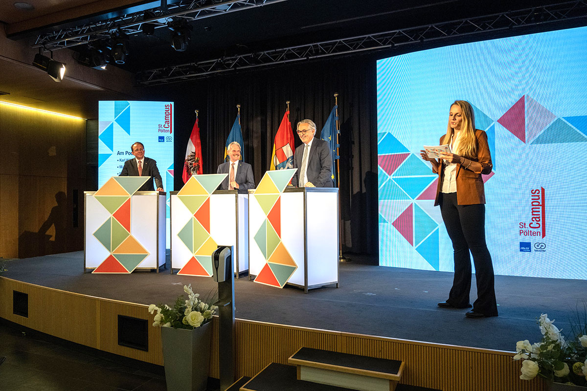 Der Campus St. Pölten ist seit Oktober 2021 der neue, gemeinsame Standort der FH St. Pölten und der 2018 gegründeten Bertha von Suttner Privatuniversität. Gestern Abend wurde der Campus mit einem Festakt offiziell eröffnet. Mit der Veranstaltung feierte die FH St. Pölten auch ihr 25-jähriges Bestehen.