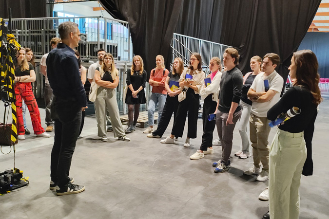 Er zeigte den interessierten Studierenden nicht nur die Veranstaltungshalle mit der state-of-the-art Technik, sondern auch den Geschäftszweig des Technikverleihs und präsentierte den Studierenden verschiedene Veranstaltungsformate. Auch spannende Hintergrundgeschichten zu Künstler*innen sowie der Branche im Allgemeinen wusste er zu erzählen.