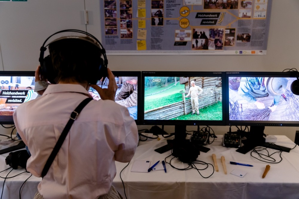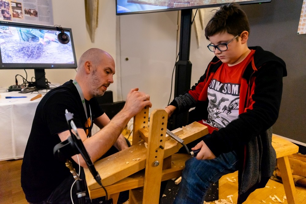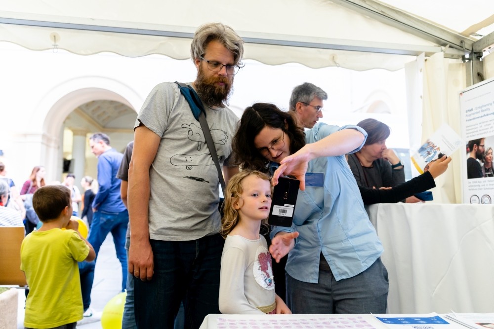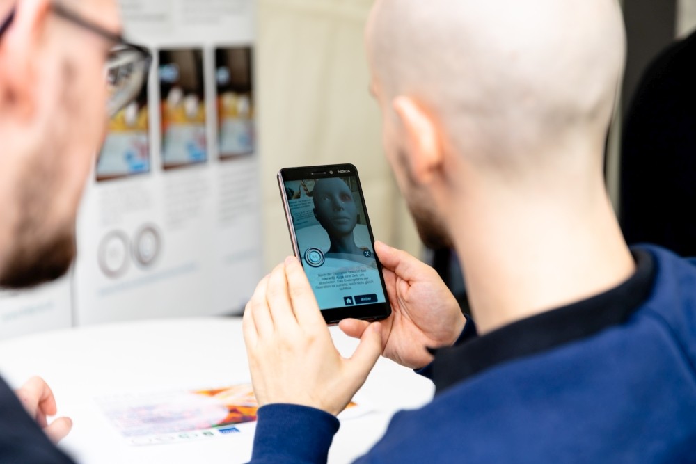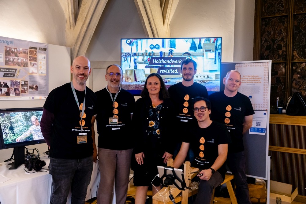Ebenfalls ausprobieren konnten die Besucher*innen eine Augmented Reality Handy-App zur Patientenaufklärung zu Schieloperationen bei der Station „Wie kann ich mit einem Handy das menschliche Auge erkunden und dabei gleichzeitig über Medizin lernen?“. Bei der Station „Altes Holzhandwerk, neue filmische Formate“ durfte man sich unter Anleitung der im Forschungsprojekt entwickelten Edutorials selbst an die Werkbank setzen um einen Holznagel herzustellen.