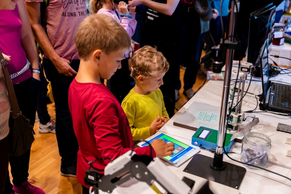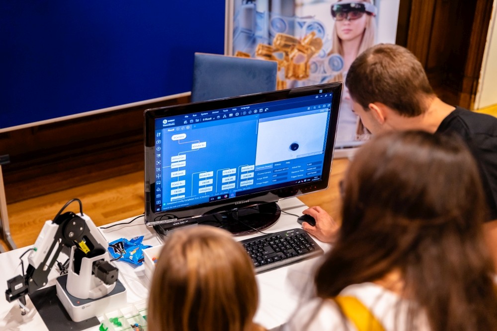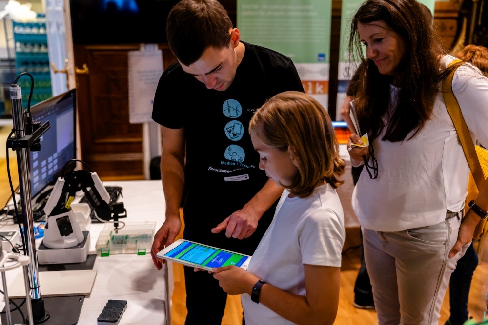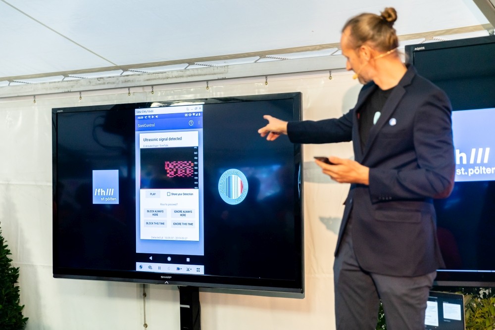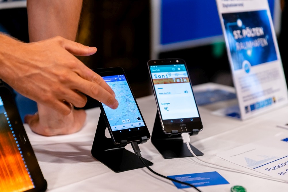 Das Thema „Kooperation zwischen Mensch und Maschine“ stand bei der Station „Wie werden die intelligenten Fabriken der Zukunft aussehen?“ der Forschungsgruppe Digital Technologies im Vordergrund. Die Zusammenarbeit mit Robotern konnte z.B. beim gemeinsamen Tic-Tac-Toe spielen oder mit dem Schokolinsen-Sortierroboter erprobt werden. Bei der Station „Wie schütze ich mich vor akustischem Tracking?“ sahen die Besucher*innen dass Handys über Ultraschall - mitunter sogar heimlich - Daten übertragen können. Zum Glück schafft die App SoniControl Abhilfe.
