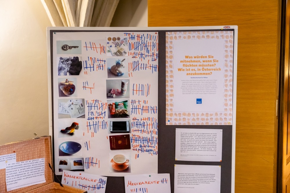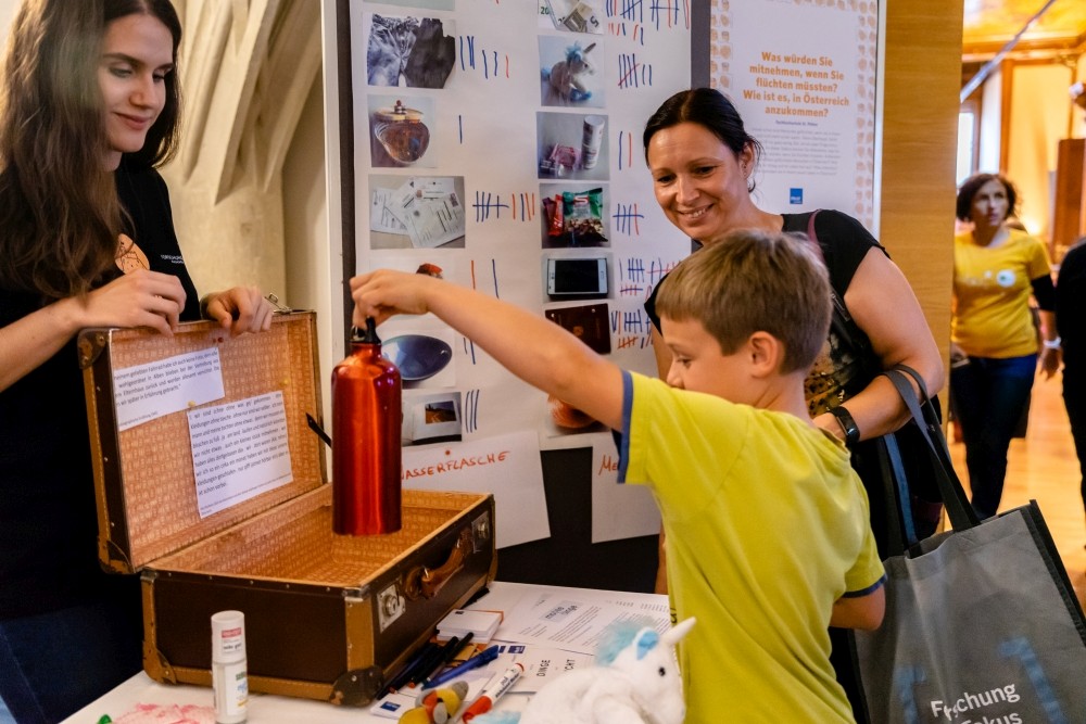 Bei unserer Station „Was würdest du mitnehmen, wenn du flüchten müsstest?“ ging es genau um diese Frage. Die meisten von uns haben zum Glück noch nie die Situation erlebt, plötzlich die Heimat verlassen zu müssen und nur wenige Habseligkeiten mitnehmen zu können. Besucher*innen sollten nur drei Gegenstände auswählen, die sie mitnehmen würden und konnten im Gespräch mit den Forscher*innen des Ilse-Arlt-Instituts über die konkreten Erfahrungen geflüchteter Menschen erfahren.