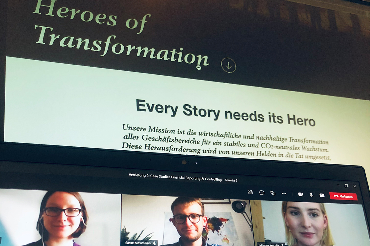 Die zehn Studierenden der fiktiven Agentur „WizViz – Wizards of Vizualisation“ haben sich in drei Gruppen den Teilen Konzeption, Content und Kommunikation gewidmet und schnell erste Ideen erarbeitet. Mit diesen ersten Ideen und vielen Fragen wurde ein Briefing-Gespräch mit den Mitarbeiter*innen der Investor Relations des Weltmarktführers geführt.