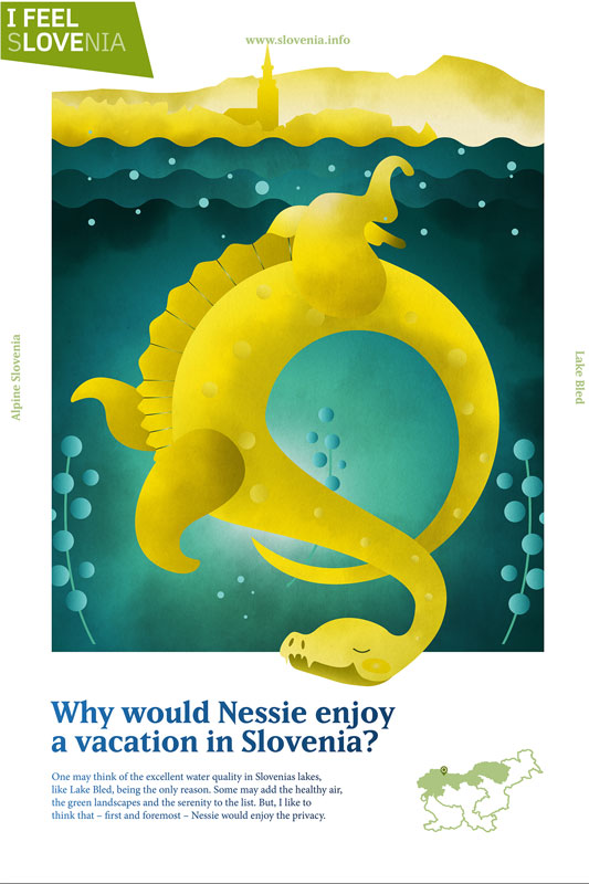 Mit dem Slogan „Why would Nessie enjoy a vacation in Slovenia?” rankt sich eine grüne, mystische Wasserkreatur sympathisch durchs Bild und offensichtlich in die Herzen der Jury. Einmal mehr hat unser Kreativ-Nachwuchs gezeigt, dass mit ihm auch international zu rechnen ist.