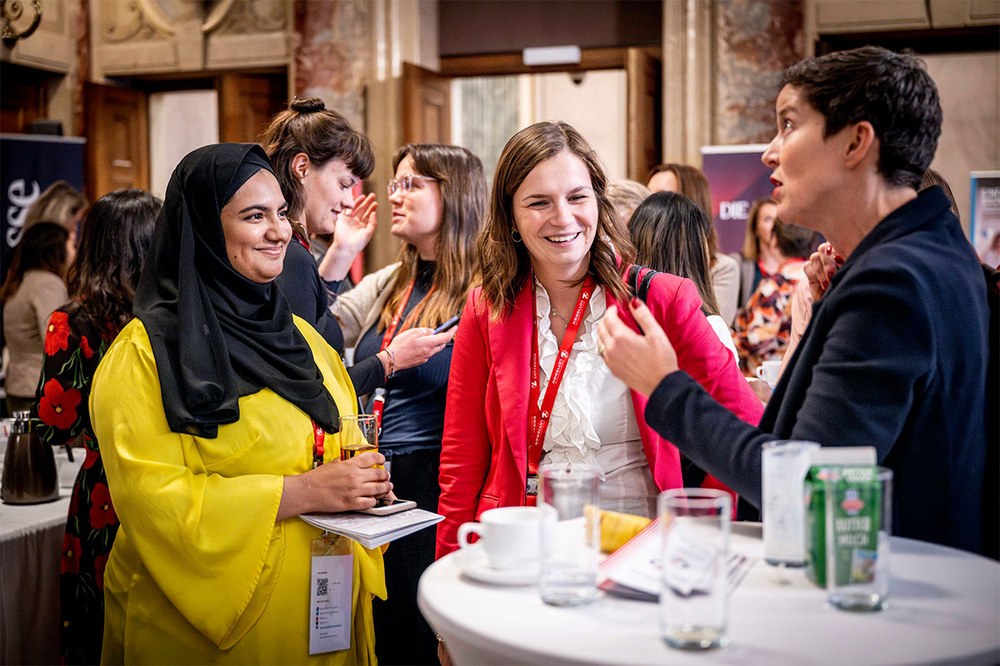 Unsere Medienmanagement-Absolventin Afifa Akhtar (1.v.l.) im Gespräch mit Kongressbesucherinnen | Copyright: Karo Pernegger