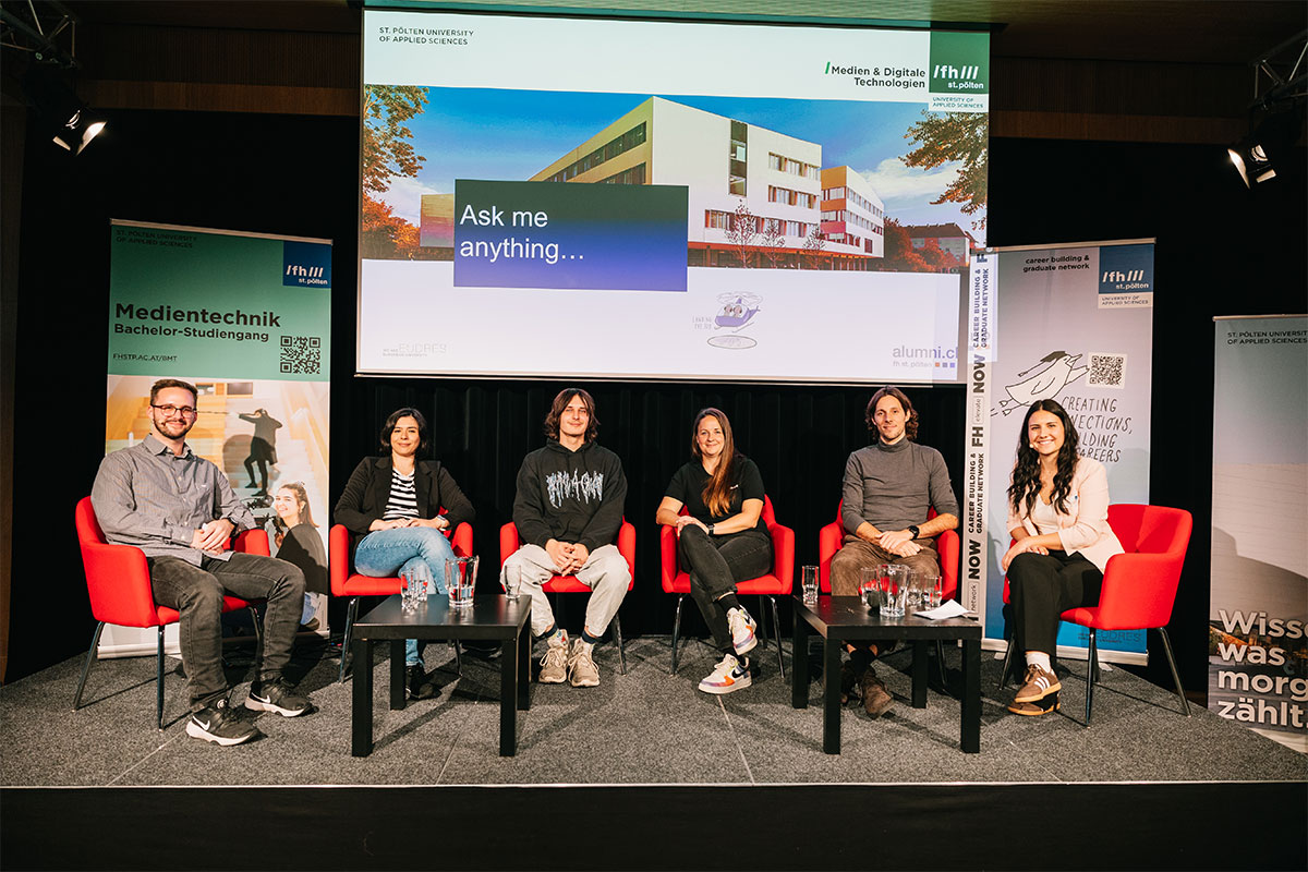 Alle machen Karriere: Die FH St. Pölten lud in diesem Jahr erneut Absolvent*innen des Studiengangs Medientechnik zum Gespräch mit Studierenden
