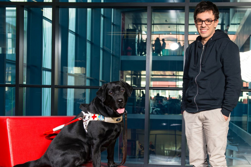 Patrick Brugger, der 21-jährige Medienmanagement-Student, hat stets seine Hündin Maggie an der Seite: Mit zwölf Jahren wurde bei ihm eine Augenerkrankung diagnostiziert, aufgrund der er mittlerweile fast vollständig erblindet ist. Die ausgebildete Blindenführhündin Maggie unterstützt ihn bei der Orientierung und gibt ihm Sicherheit im Alltag. So ist das Studium an der FH St. Pölten trotz Sehbeeinträchtigung möglich.