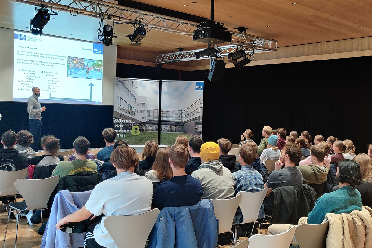 Inhalte aus den Lehrveranstaltungen „Prävention durch Physiotherapie“ sowie „Trainingslehre & Trainingstherapie“ konnten gemeinsam mit dem Gastvortragenden gestaltet werden – sowohl praxisorientiert in Kleingruppen als auch in Form eines englischsprachigen Vortrags für den gesamten ersten Jahrgang.