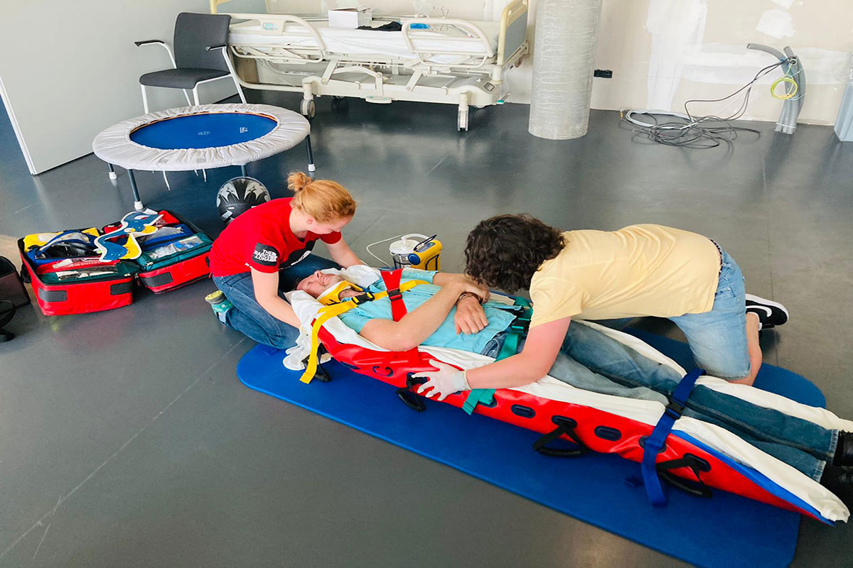 Unter der Leitung von Modulleiter Stefan Rottensteiner und FH-Dozent Manuel Kaider stellten sich auch die bereits ausgebildeten Rettungs- und Notfallsanitäter*innen einer FH-internen Upgradeprüfung bei deren Absolvierung die Studierenden nicht nur aufgrund der heißen Außentemperaturen ins Schwitzen kamen.