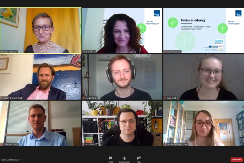 Letzte Woche wurde zum ersten Mal der Sustainable Development Award der FH St. Pölten für studentische Arbeiten vergeben, die sich mit Themen zu nachhaltiger Entwicklung beschäftigen. Die Studierenden präsentierten ihre Projekte online beim Tag der Nachhaltigkeit.