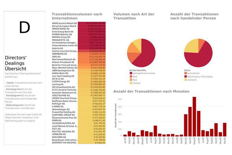 Die Veröffentlichung von Directors' Dealings ist ein zentrales Anliegen im Sinne eines fairen und transparenten Kapitalmarkts. Die Wiener Börse leistet dazu mit der laufenden Zusammentragung der entsprechenden Einzelmeldungen einen gewichtigen Beitrag und stellt diese Dokumente auch auf ihrer Website zur Verfügung. Das ersichtliche Datenvolumen ist enorm: Allein im Zeitkorridor zwischen 2019 und 2020 wurden im Amtlichen Handel der Wiener Börse knapp 3.000 Eigenschäfte getätigt. Eine regelrechte Flut an gesammelten Meldungen also, welche die Dimensionen dieser Geschäfte zwar erahnen lassen, das Desiderat einer ganzheitlichen Darstellung zur tiefergehenden Betrachtung aber nicht erfüllen.