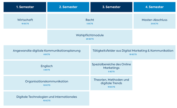 Im 2. Semester stellt die angewandte digitale Kommunikationsplanung (Schwerpunkt: Online-Marketing) ein verpflichtendes Modul dar. Dieses Modul behandelt unter anderem die Planung und die Umsetzung von realen Social Media Kampagnen (z.B. Facebook- und Instagram-Kampagnen), wobei die Studierenden alle Phasen vom Erstellen der Werbemittel bis hin zur Kampagnenoptimierung selbst erarbeiten können.