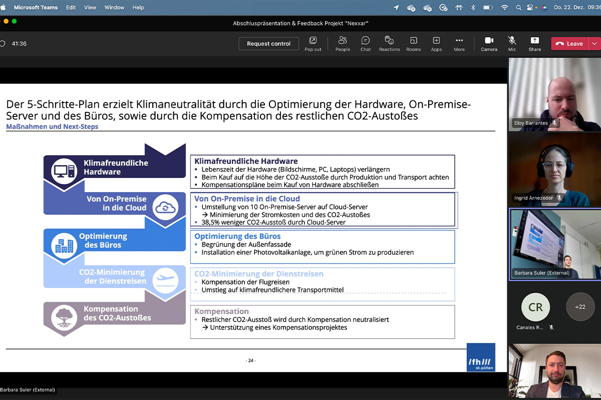 Für das Unternehmen nexxar wurden der aktuellen CO2-Ausstoß und entsprechende Optimierungsmöglichkeiten ermittelt. Dazu erstellten die Studierenden „Scope vs No-scope-Unterlagen“, und sie lernten Consultingtätigkeit in Form eines Unternehmensprojekts kennen. Analysiert wurden unterschiedlichste CO2-Reportings und Klima KPIs. Aufgrund der Daten wurden Maßnahmen und Meilensteine auf dem Weg zur Klimaneutralität des Unternehmens festgelegt