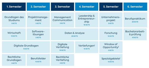 Das Grundlagenstudium vermittelt dir Wissen und Know-how in den Bereichen Wirtschaft, Projektmanagement, digitale Kompetenzen, IT, Recht sowie in E-Commerce, Controlling & Finance, Personalmanagement, Nachhaltigkeitsmanagement, Marketing und Logistik. Deine englischen Sprachkenntnisse, deine Präsentationskompetenz, deine analytischen Fähigkeiten und deine Kreativität werden vernetzt und praxisorientiert im Rahmen der fachlichen Lehrveranstaltungen sowie einer Business English-Lehrveranstaltung gestärkt.