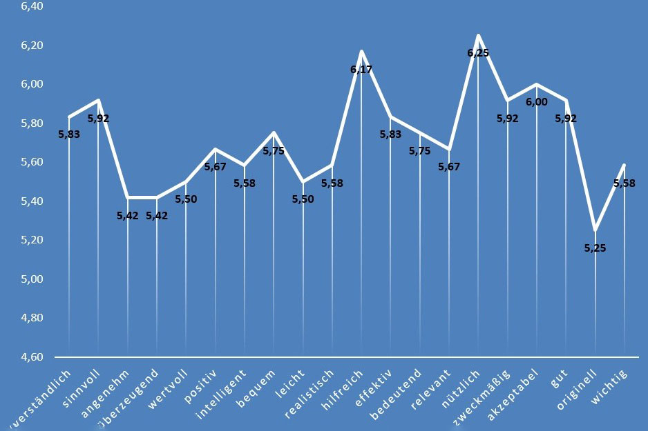 Die Gruppe der EDV-gestützten Pflegedokumentation mittels WicareIDoc (n=12) wurde ebenso auf einer 7-stufigen Likert-Skala befragt, wie es ihnen mit der Anwendung dieses Systems ergangen ist. Der niedrigste Mittelwert lag bei 5,25 Punkte „originell“. „Hilfreich“ und „nützlich“ waren jene Adjektive, die im Durchschnitt über 6 Punkte erzielten. Insgesamt ist die Zufriedenheit mit der Anwendung dieses EDV-Systems überdurchschnittlich positiv bewertet worden (siehe Abbildung 3).