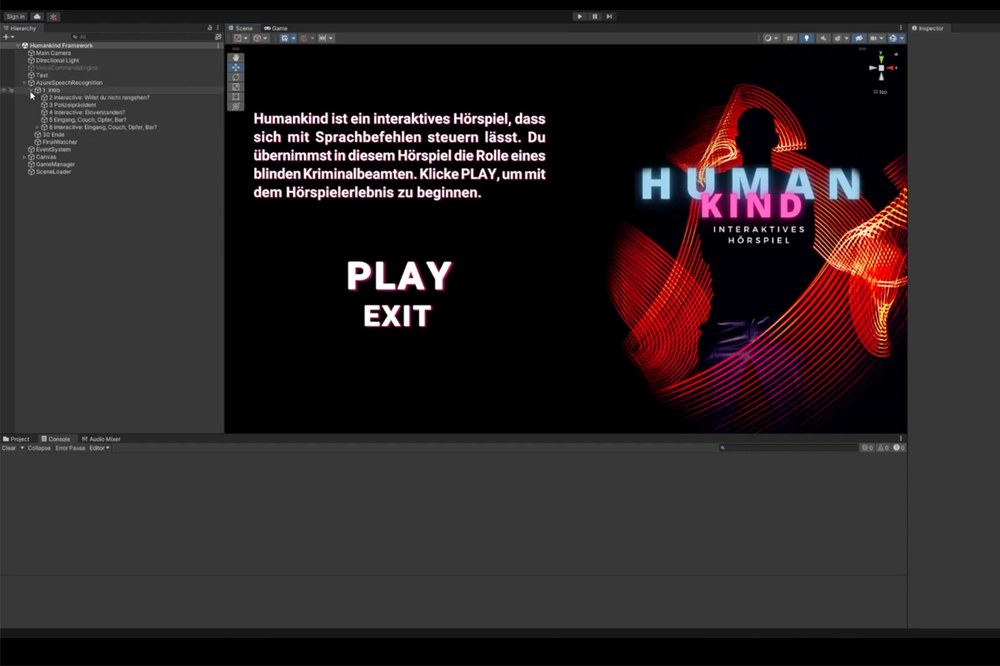 Humankind ist ein interaktives Hörspiel in Unity, das ausschließlich durch Sprachbefehle gesteuert wird und dessen Ablauf nicht linear, sondern interaktiv gestaltet ist.