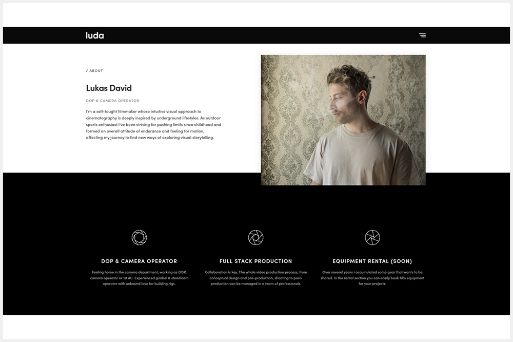 "Lukas Davids Arbeit mit der Kamera ist äußerst vielseitig und immer das Resultat von künstlerischem Anspruch gepaart mit bestmöglicher technisch-kreativer Lösung. Auch die Portfolio-Webseite hat er so gestaltet", sagt Masterklassenleiterin Rosa von Suess in ihrer abschließenden Bewertung. "Durch filmische Übergänge und geplante Reduktion verweist das Design und die Navigation auf das Wesentliche seiner Arbeit: die Gestaltung und Produktion von hochwertigen bewegten Bildern. Als Domain verwendet er ein Akronym seines Namens. Auch hier fügt er nichts Neues hinzu, sondern erreicht seine Lösung durch Reduktion."