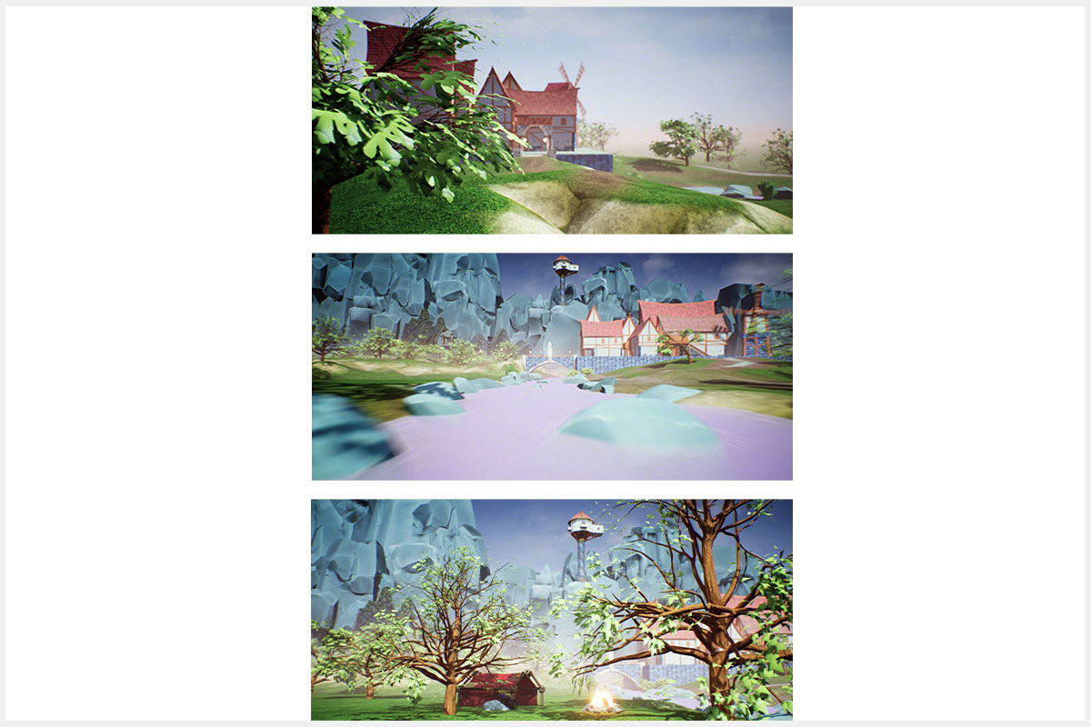Die erste abgeschlossene Projektphase drehte sich um die Gestaltung der 3D-Umgebung, die schlussendlich als Hintergrund dienen soll. Neben der Ausarbeitung eines visuellen Grundkonzeptes wurden Modelle sowie Texturen erstellt, die man in die Landschaft eingearbeitet hat. Als besonderes Extra gibt es Feuer-Effekte und einen Tag-Nacht-Rhythmus, der die Szene dynamisch beleuchtet.