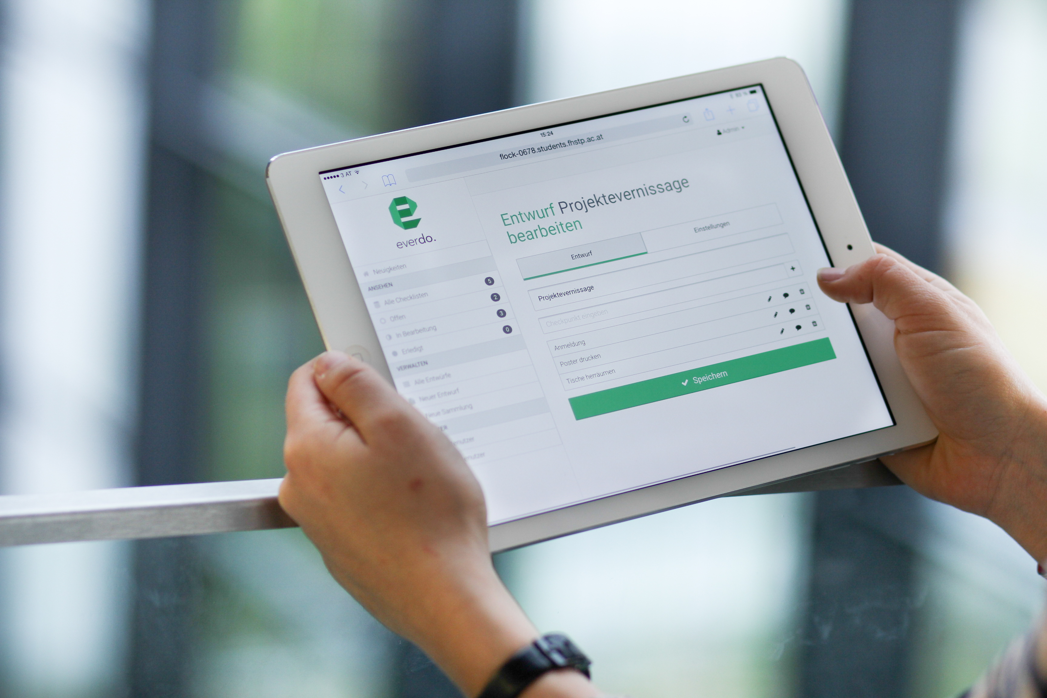 Um es Organisationen und Vereinen zu erleichtern Aufgaben zu delegieren, haben wir ein Aufgabenverwaltungstool mit dem Namen "everdo" entwickelt. Grundsätzlich ist dieses Tool für jedermann gedacht, aber die Hauptzielgruppe sind Vereine und gemeinnützige Organisationen. Der Ablauf der Seite beginnt mit einer Registrierung, um seinen eigenen Account anzulegen. Um die Checklisten, die man anlegt, auch Freunden und Mitgliedern schicken und zuweisen kann, muss man diese zuerst anlegen. Alles was man dafür braucht, ist die E-Mail Adresse. Das Mitglied, der die Checkliste bekommen hat, arbeitet diese dann ab und schickt sie dann dem Administrator zurück. Als Administrator hat man zusätzlich eine Übersicht über den aktuellen Zustand der Checkliste – insgesamt gibt es drei Zustände, welche „Offen“, „in Bearbeitung“ und „Erledigt“ sind.