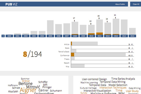 Publikationen werden in der Regel als textuelle Listen dargestellt, die nach Autor oder Typ sortierbar sind. PubViz bietet neue Formen der Darstellung solcher Daten sowie Möglichkeiten zur Interaktion und Exploration. Verschiedene Darstellungsarten, wie zum Beispiel eine Timeline oder eine Wordcloud, sind miteinander koordiniert und stellen vielfältige Filtermöglichkeiten zur Verfügung. Klickt man in der Timeline einen Jahresbalken an, so ändern sich alle anderen Darstellungen dementsprechend mit; es werden nur mehr die Publikationen hervorgehoben, die in besagtem Jahr publiziert wurden.