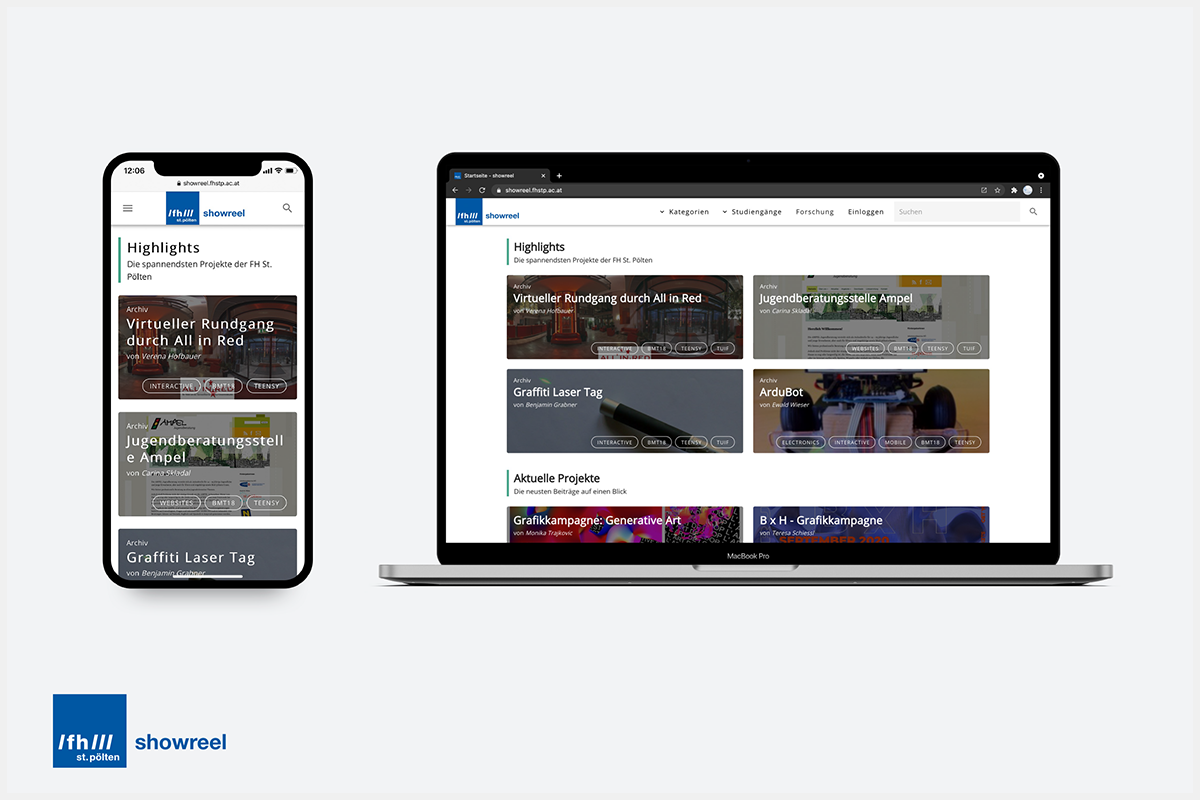 Im ständigen Austausch mit den Auftraggeber*innen wurden dem Anforderungsprofil sukzessive kleine Details hinzugefügt, sodass das neue Showreel allen Mitarbeiter*innen und Studierenden der Fachhochschule die Funktionen bieten kann, die sie im Rahmen der Erstellung ihres virtuellen Portfolios brauchen.