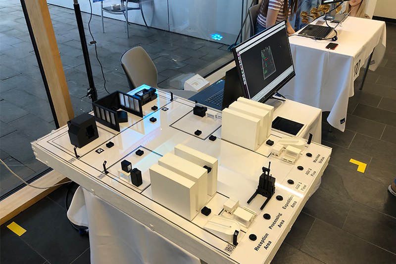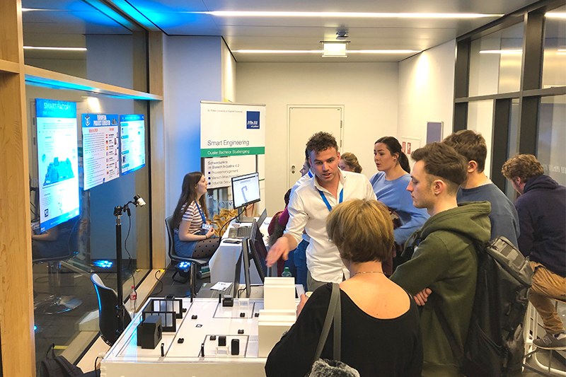 In this interactive installation, all different kinds of technologies will be implemented. This installation is used by the Smart Engineering Department during the open.days of the St. Pölten UAS in order to attract young engineers for a technical study programme. This installation contains technologies such as microcontrollers, a vision camera system and QR-Codes which provide you with live data of the factory.