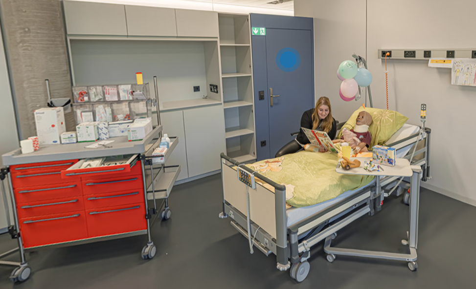 - A clinical area with hospital beds for practical training exercises. These areas can be individually adjusted to different requirements, settings, and competence levels and thereby allow for professional simulation.