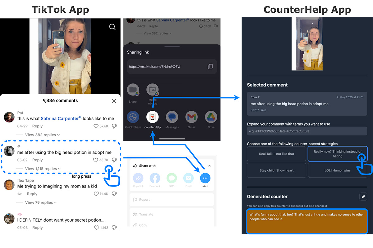 A central outcome of the Counter Speech project is the development of the app “CounterHelp” which helps young people to easily create their own counter speech comments on TikTok. The app analyses the selected comment, takes all connected information into account, and uses a language model to generate suggestions in different styles – from empathic to humorous. A user study confirms the tool’s usefulness and broad acceptance.