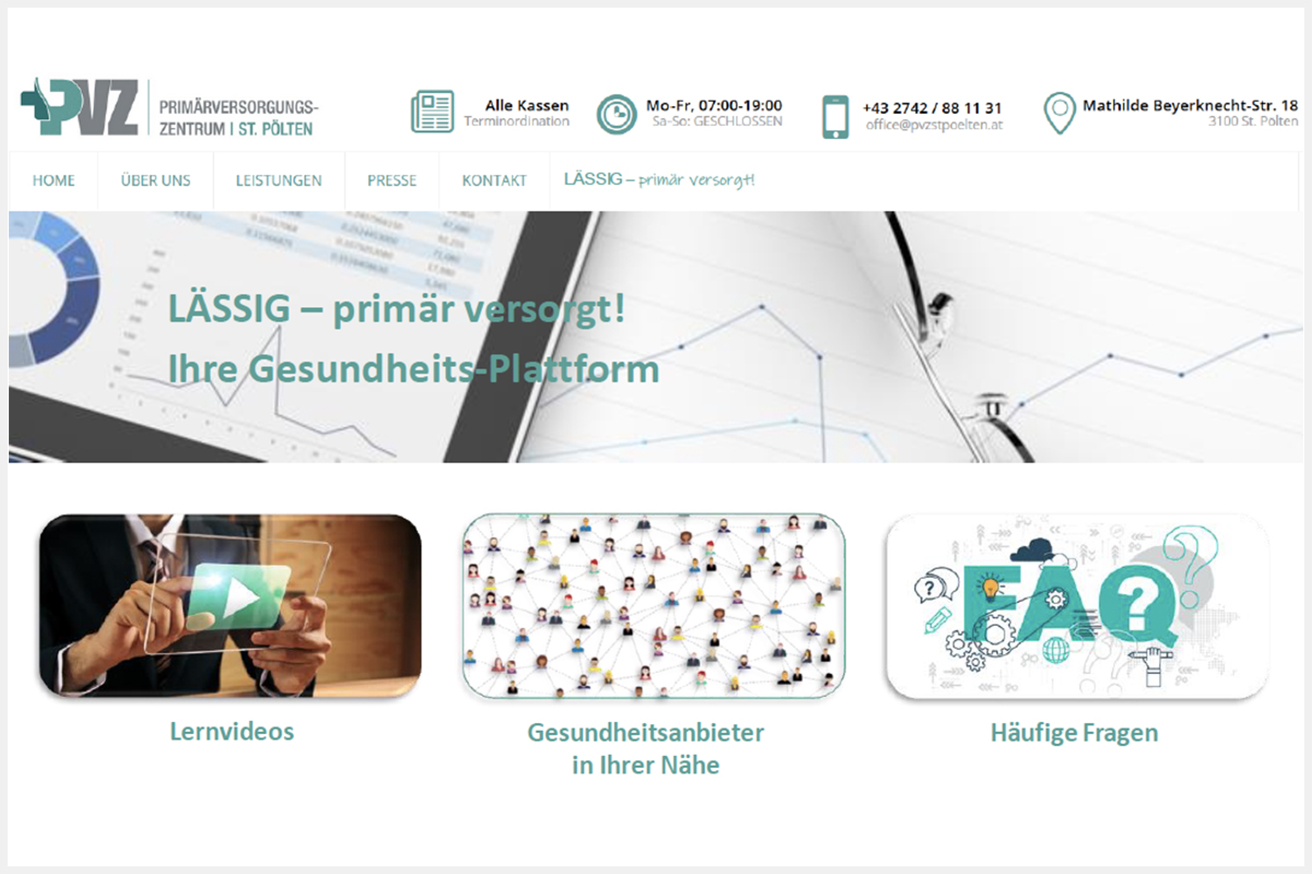 Therefore, the aim of this project is the conception and creation of an online platform for the primary health care (PHC) centre St. Pölten. It should increase empowerment and health literacy of the clients, make interdisciplinary communication easier and more effective and support non-medical, regional health care providers.